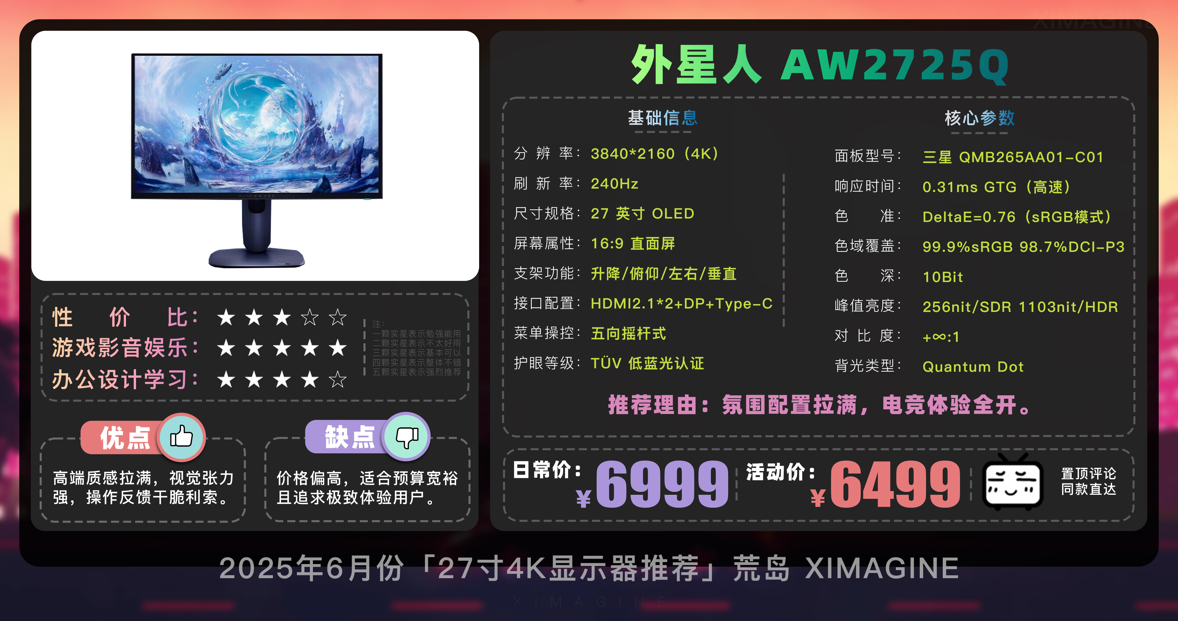 外星人 AW2725Q 采用三星C01面板,27寸4K 240Hz高刷 OLED 屏,不只是有牌面,它的实际体验确实高级。操作非常丝滑,视觉观感稳,画面响应几乎是秒贴操作节奏。我一度用它打APEX和剪Davinci的短片,体验都超顺。虽然预算上不太友好,但它给到的那种我在用好东西的心理满足很真实,非常适合发烧友。当前活动价6499元,超一线定位价格偏贵,但体验与品牌溢价双在线。