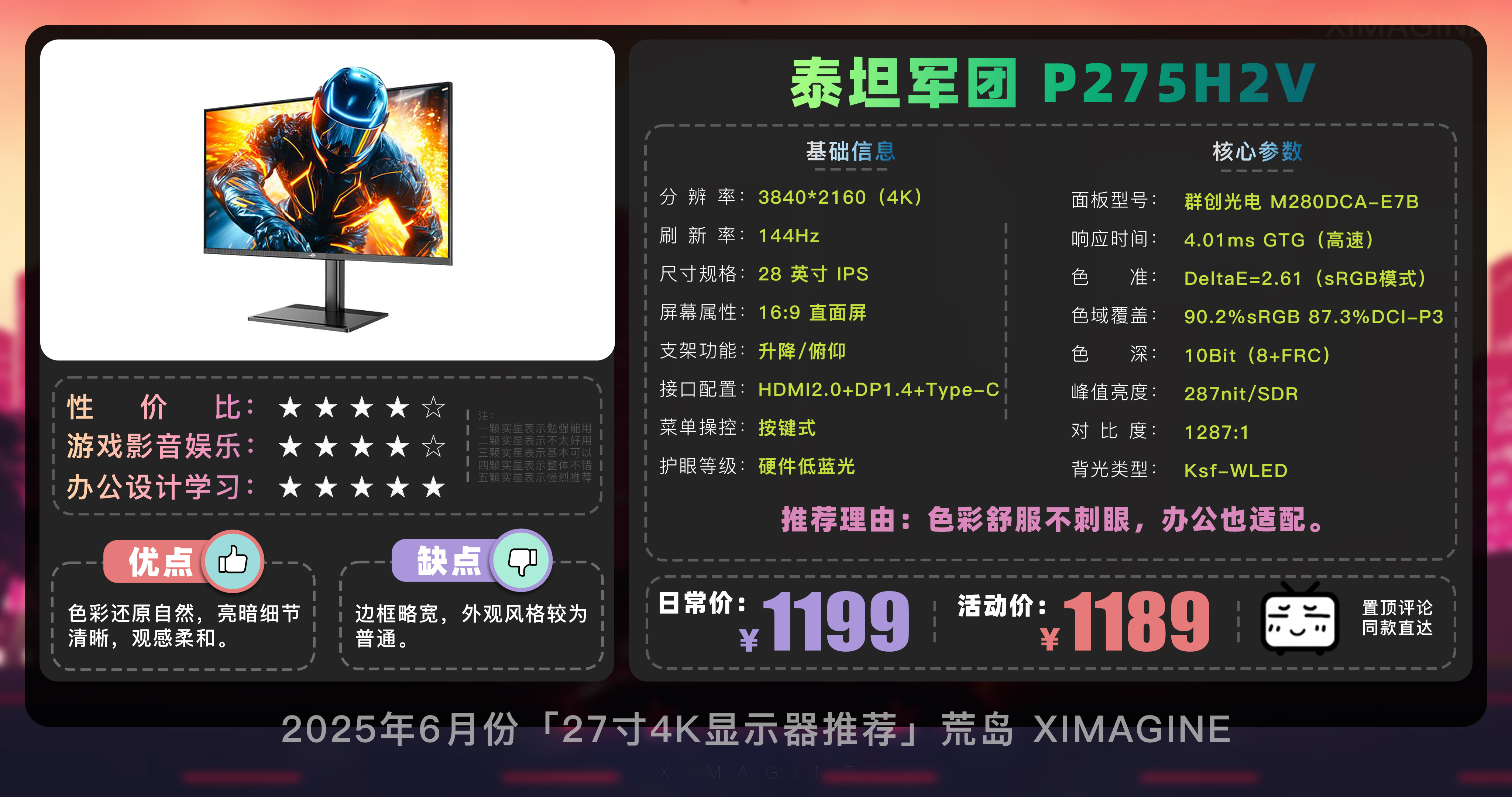 泰坦军团 P275H2V 采用群创E7B面板,27寸4K 144Hz高刷,整体观感给人一种很沉稳的感觉,不会特别炫技,但细节表现始终在线。我用它处理图文、做文档切换、甚至拿它追番,都觉得画面很耐看。没有那种一下子抓眼球的鲜艳,但久看不累,比较适合偏日常用途的用户。如果你是那种既要办公,又偶尔玩点单机轻游戏,它的体验是非常平衡的。当前活动价1189元,中低价位里多场景兼容型办公显示器。