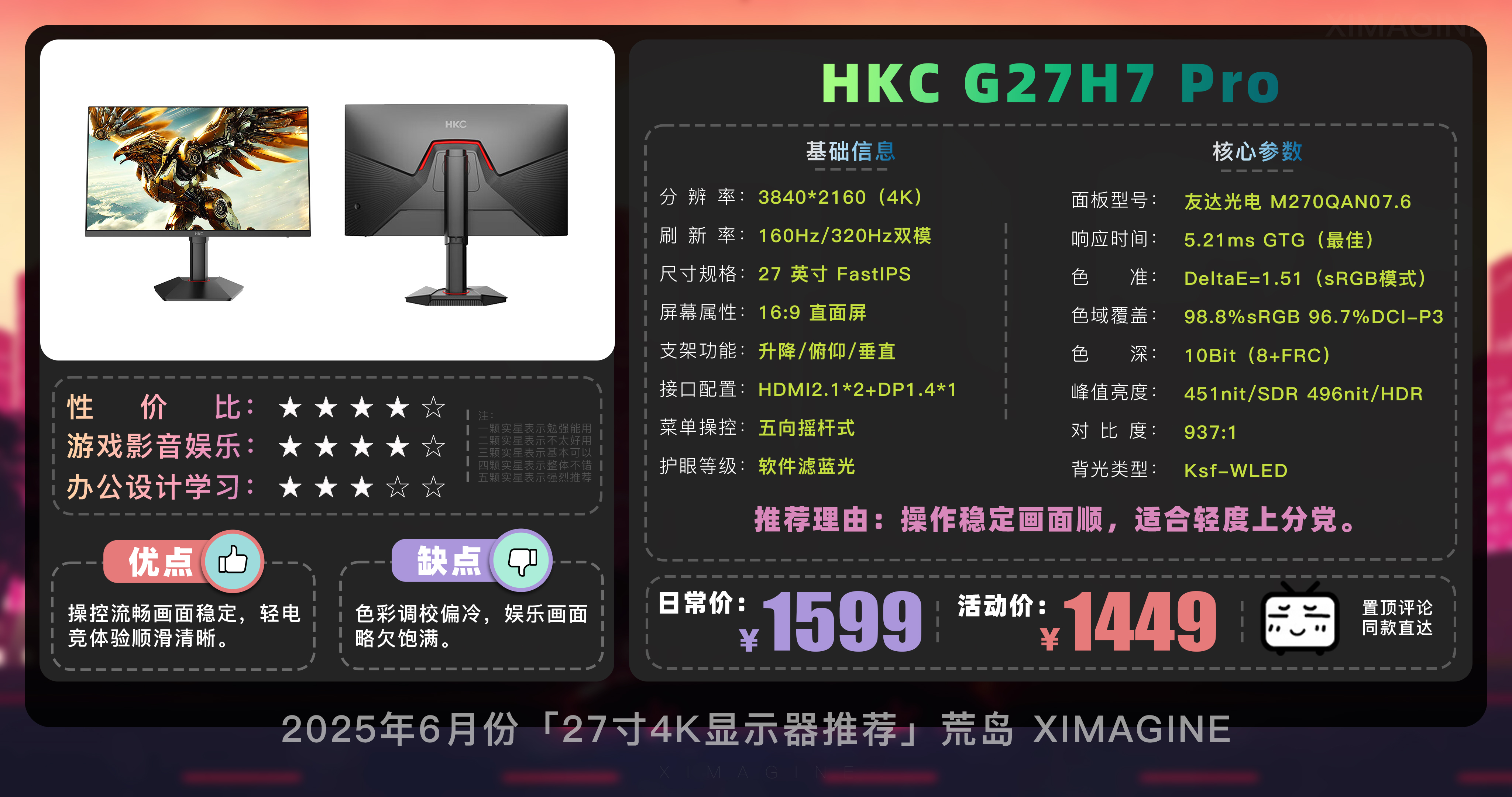 HKC G27H7 Pro 采用友达7.6面板,27寸4K 160Hz高刷,双模可切1K 320Hz刷新率,表现比较平均,虽然没有特别突出的视觉风格,但打游戏时反馈很稳定,特别适合节奏不是很快的游戏类型。我日常看视频、写文稿它都能胜任。色彩偏冷一点,看习惯了反而有种清爽感。是一块上手不用适应期的省心型显示器。当前活动价1449元,无短板桌搭伴侣,日常稳定输出选手。