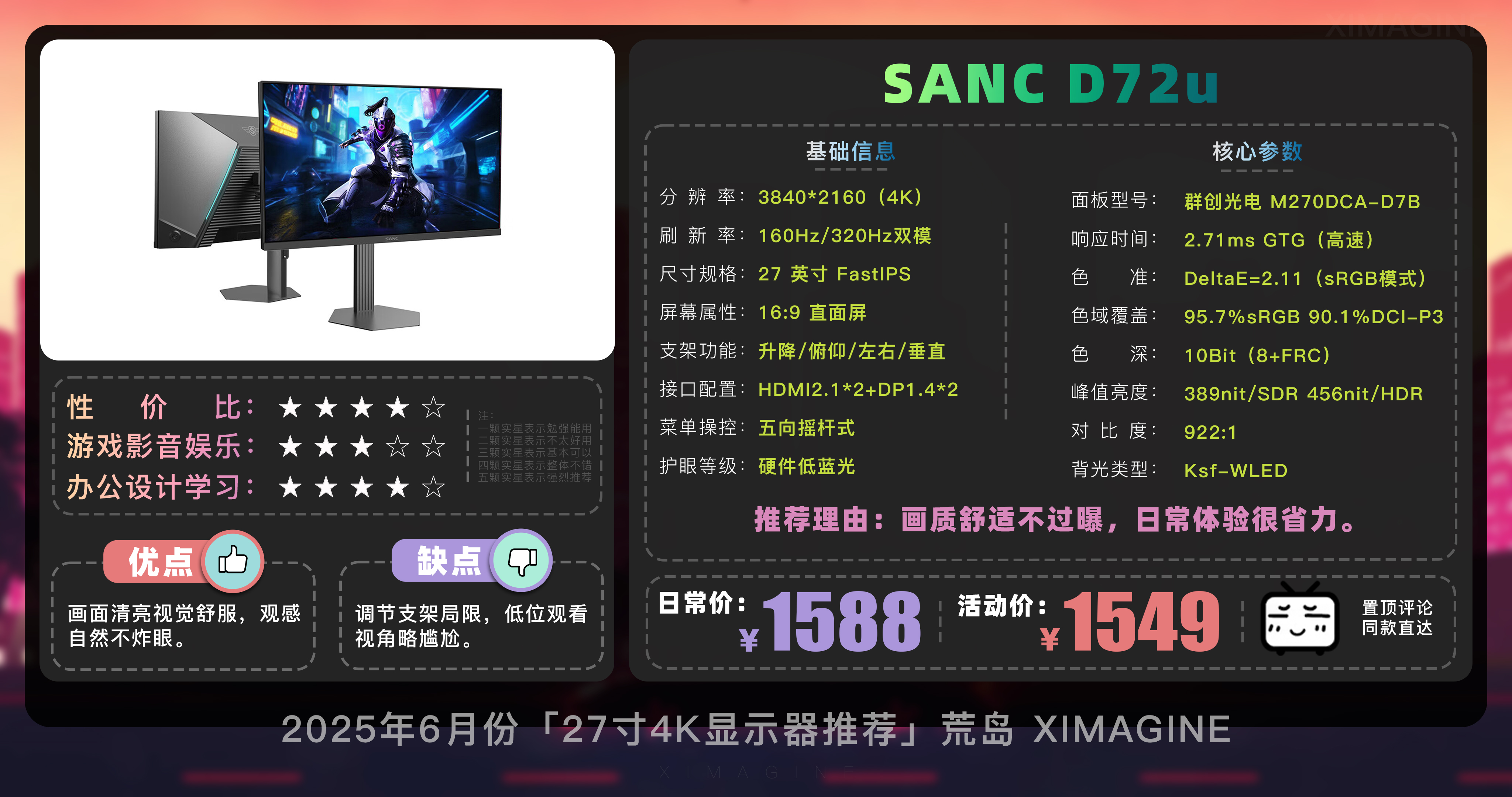 SANC D72u 采用群创D7B面板,27寸4K 160Hz高刷,双模可切1K 320Hz刷新率,这款给我的第一感觉是看着不累,尤其是做长期文字处理或者阅读型工作的时候,眼睛真的不会酸。打游戏时它的操作感中规中矩,没有太多电竞特性,但画面稳定、拖影不明显。比较适合那种白天办公、晚上轻度娱乐的复合型用户使用。当前活动价1549元,视觉护眼型优选,适合高频使用文档的用户。
