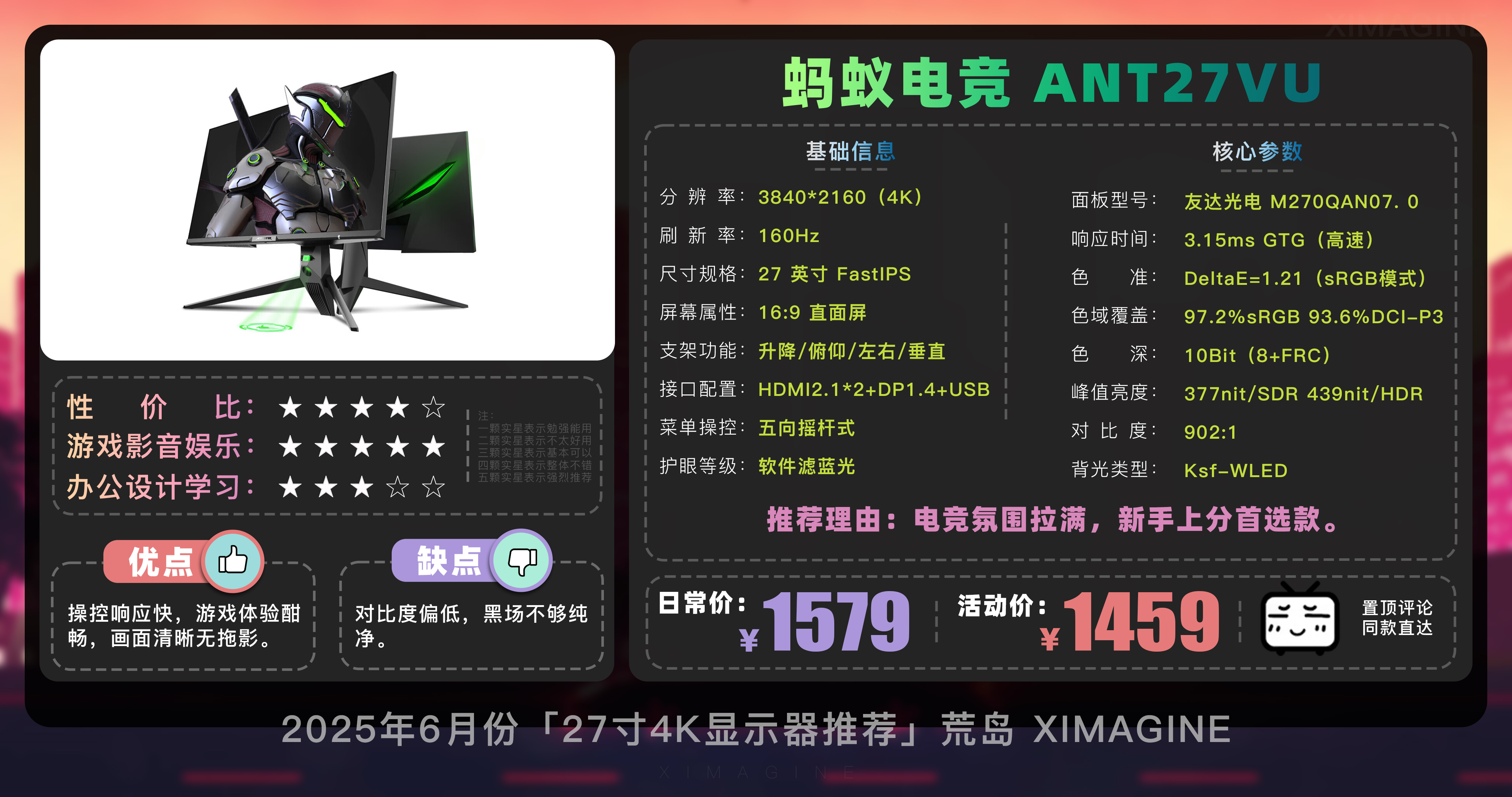 蚂蚁电竞 ANT27VU 采用友达7.0面板,27寸4K 160Hz高刷,这款屏幕的电竞感确实挺强的,我上手就拿它打了几把OW2和Valorant,操作起来非常爽快,开镜、甩枪都很跟手。色彩观感稍微偏冷,看起来干净利落,适合那种节奏感强的游戏党。我也尝试过用它剪片,虽然在色彩准确度上没有特别惊艳,但稳定性很好,导出时基本一致。它就是那种上分专用的类型,适合希望在游戏上有提升的玩家来做主屏。当前活动价1459元,性价比不错,适合主力游戏屏玩家入手。