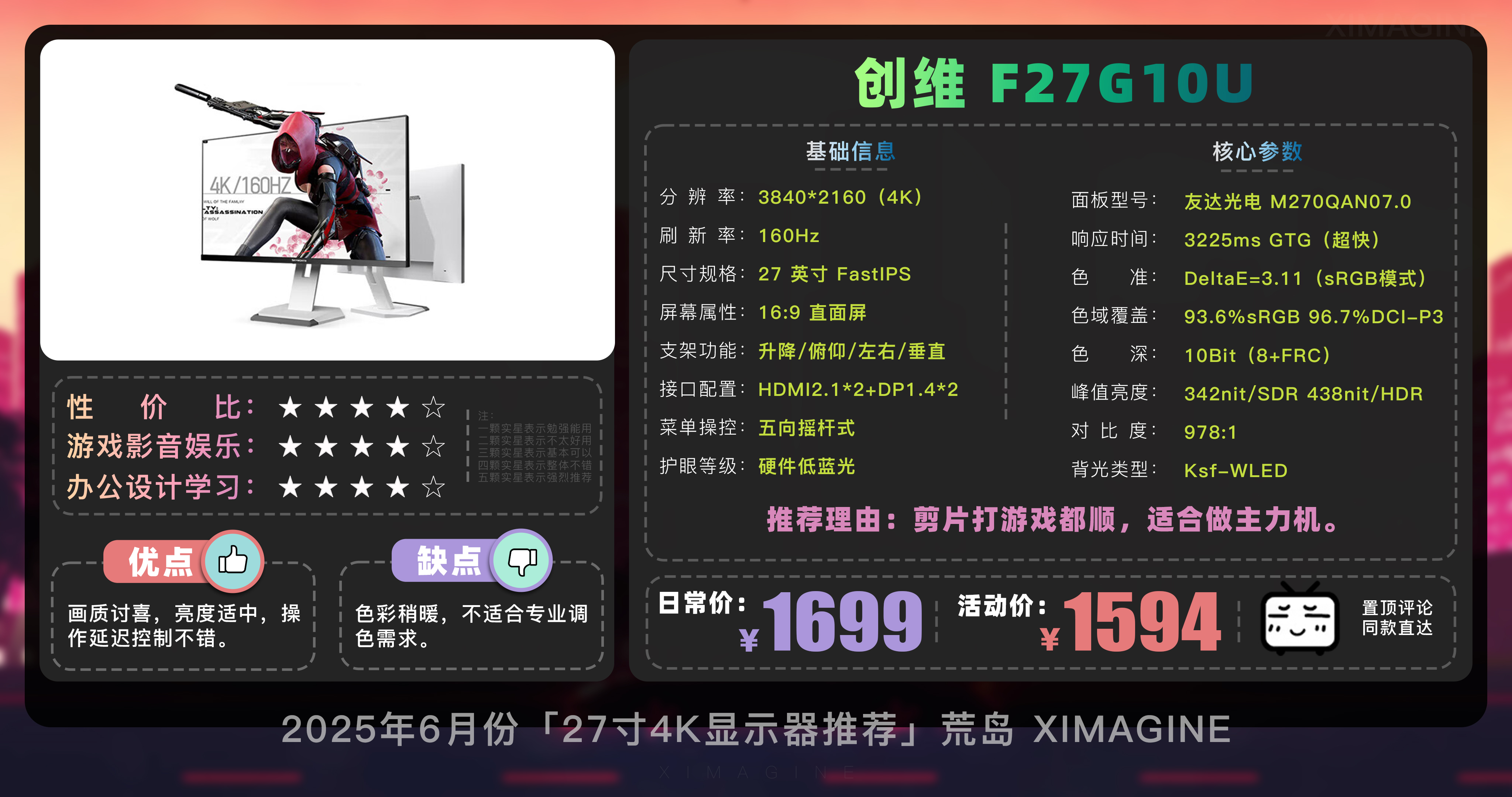 创维 F27G10U 采用友达7.0面板,27寸4K 160Hz高刷,画面属于讨喜型,颜色偏暖,用来看番或者娱乐内容特别舒服。它的流畅度和操作跟手感也不错,我打了几盘 MOBA 类游戏,感觉反馈稳定。亮度在房间灯光偏暗时表现很好,眼睛不会累。它不主打电竞或专业创作,更偏向于那种稳用久看的屏幕,适合偏轻娱乐的用户。当前活动价1594元,视觉观感型选手,适合办公娱乐轻混搭。