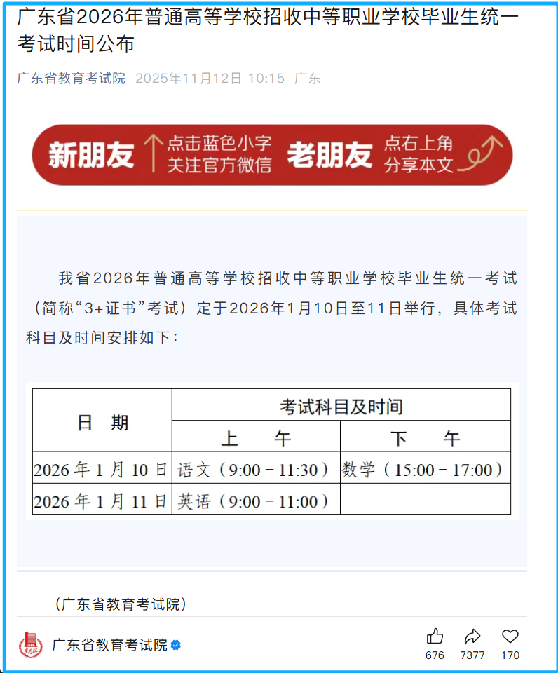 根据广东省教育考试院官方消息,2026年广东3+证书高职高考定于1月10日至11日举行,具体考试科目及时间安排如下: