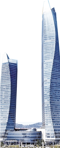 航拍青岛海天大酒店(左)和青岛瑞吉酒店(右)。王雷 摄
