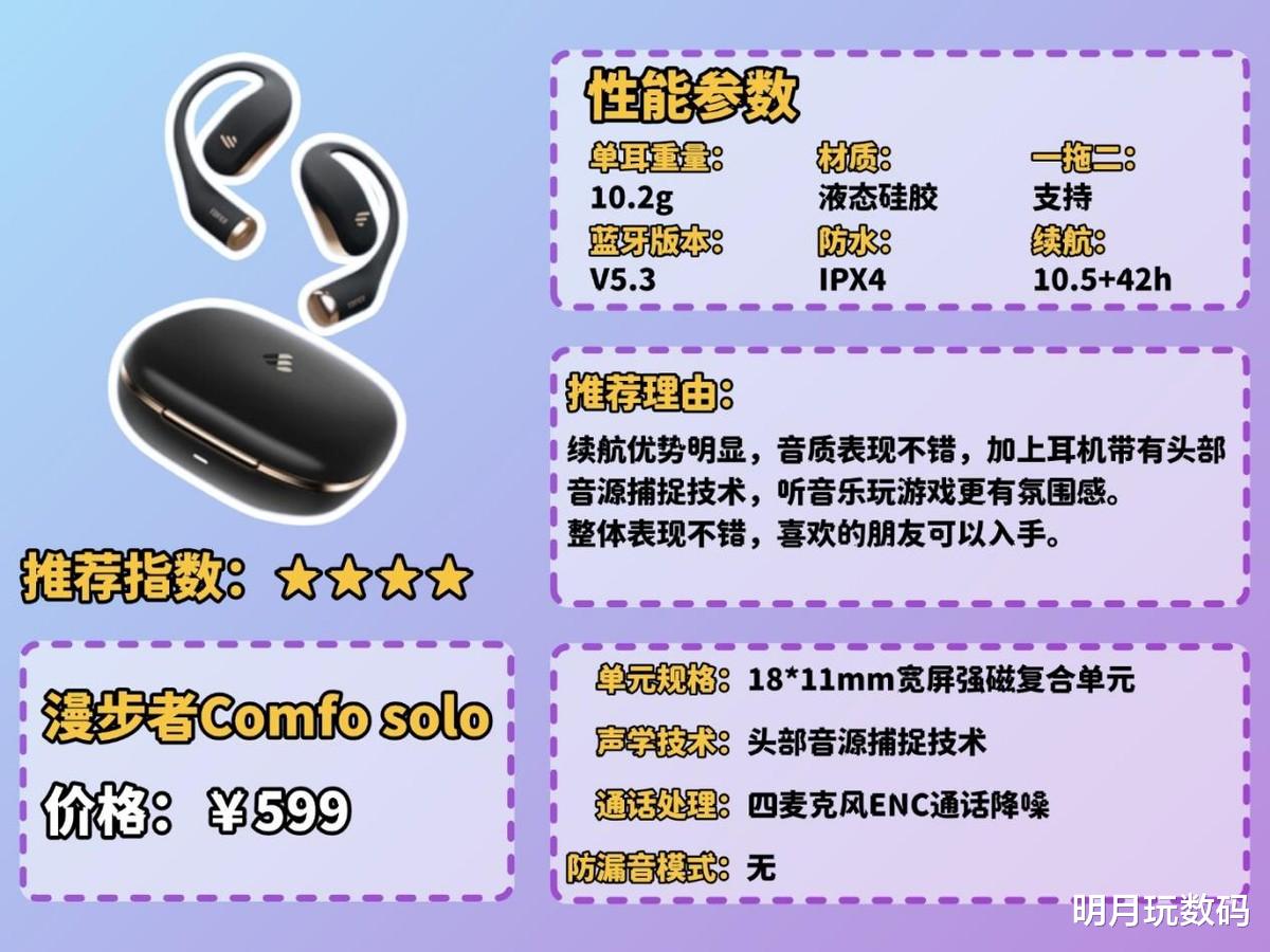 总结:漫步者 Comfo solo 算是很能打的了,空间感和续航都很出彩,日常用完全足够,要是你喜欢听着有氛围感的音乐,选它准没错!