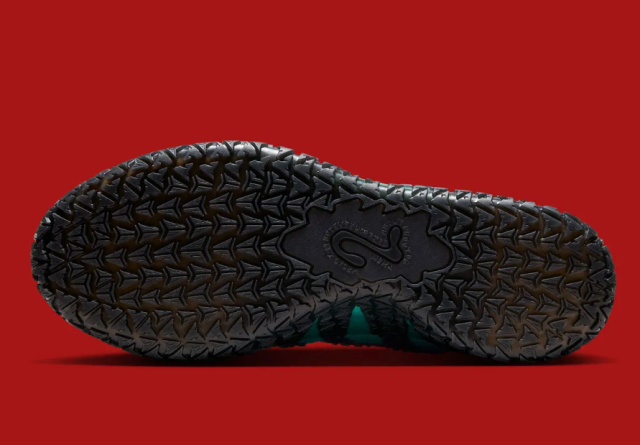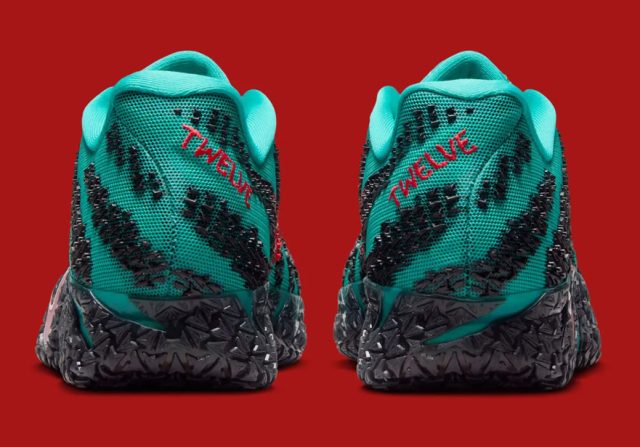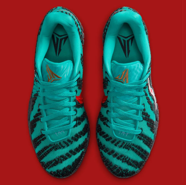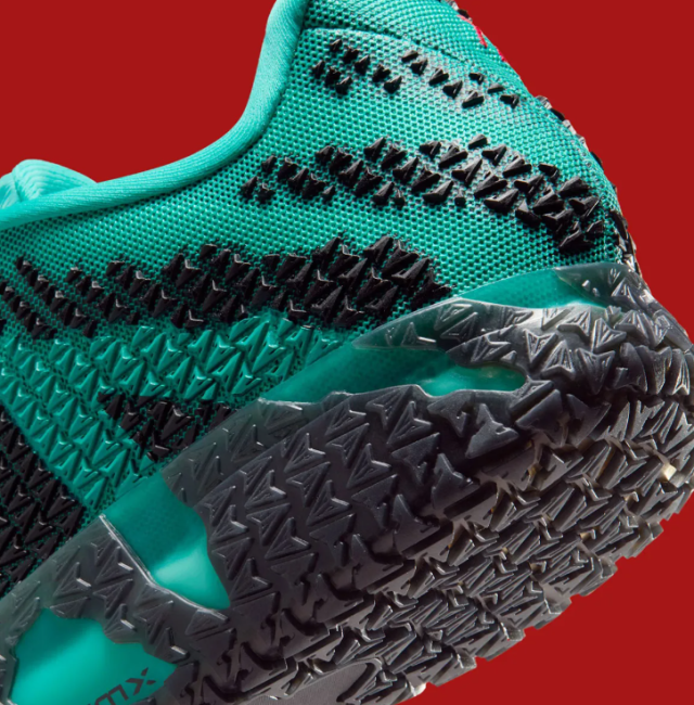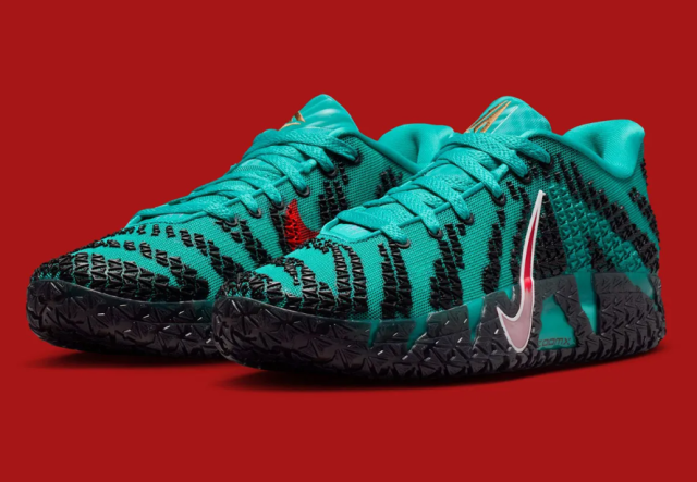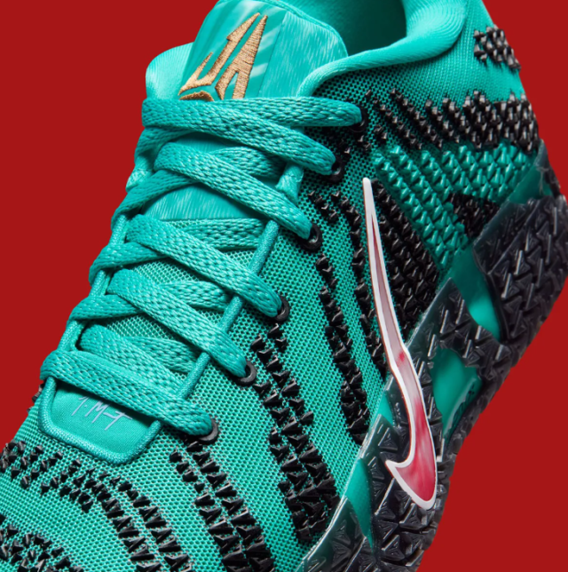 对比起Nike Ja 2「Scratch」较为鲜艳的亮绿色,Nike Ja 3「Scratch」采用了更加沉稳的蓝绿色进行点缀,搭配上黑色元素进行搭配,呈现出了少有的内敛风格;但是鞋履上方Logo等位置选择了红色进行点缀,加上一些渐变元素,也能够感受到鞋履色彩设计带来的独特“能量”。