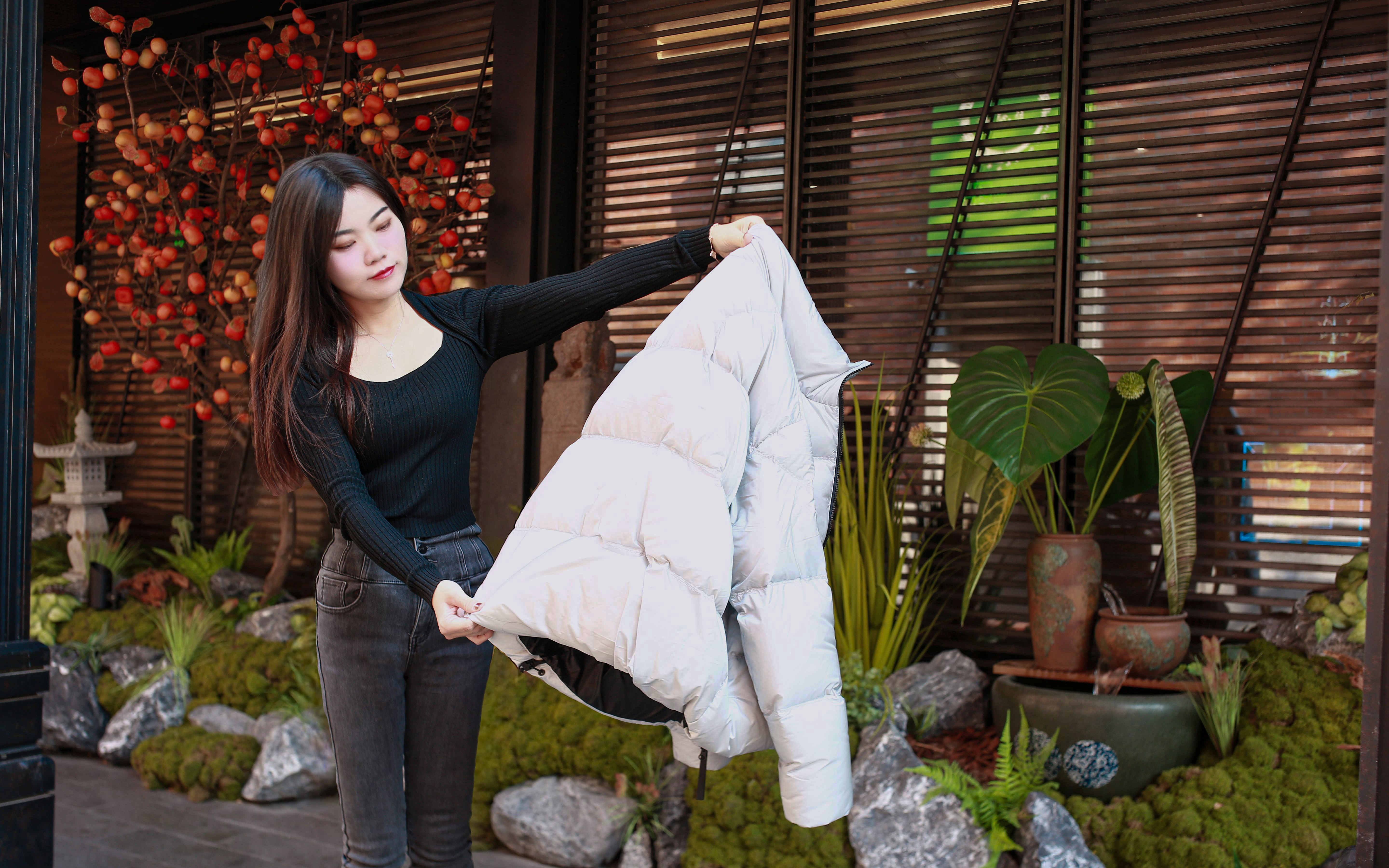 它真的轻到存在感非常低。对女生来说,就是“肩膀和脖子不会累”的那种幸福。版型上,显瘦、有线条、腿显长、特别适合小个子。我最怕的就是羽绒服一穿就“上升气球化”。但这件鹅铠甲我第一眼试穿时,真的有点惊到。短款 + 宽松版型,却不显胖,甚至在搭配高腰裤的时候还有点显腿长。