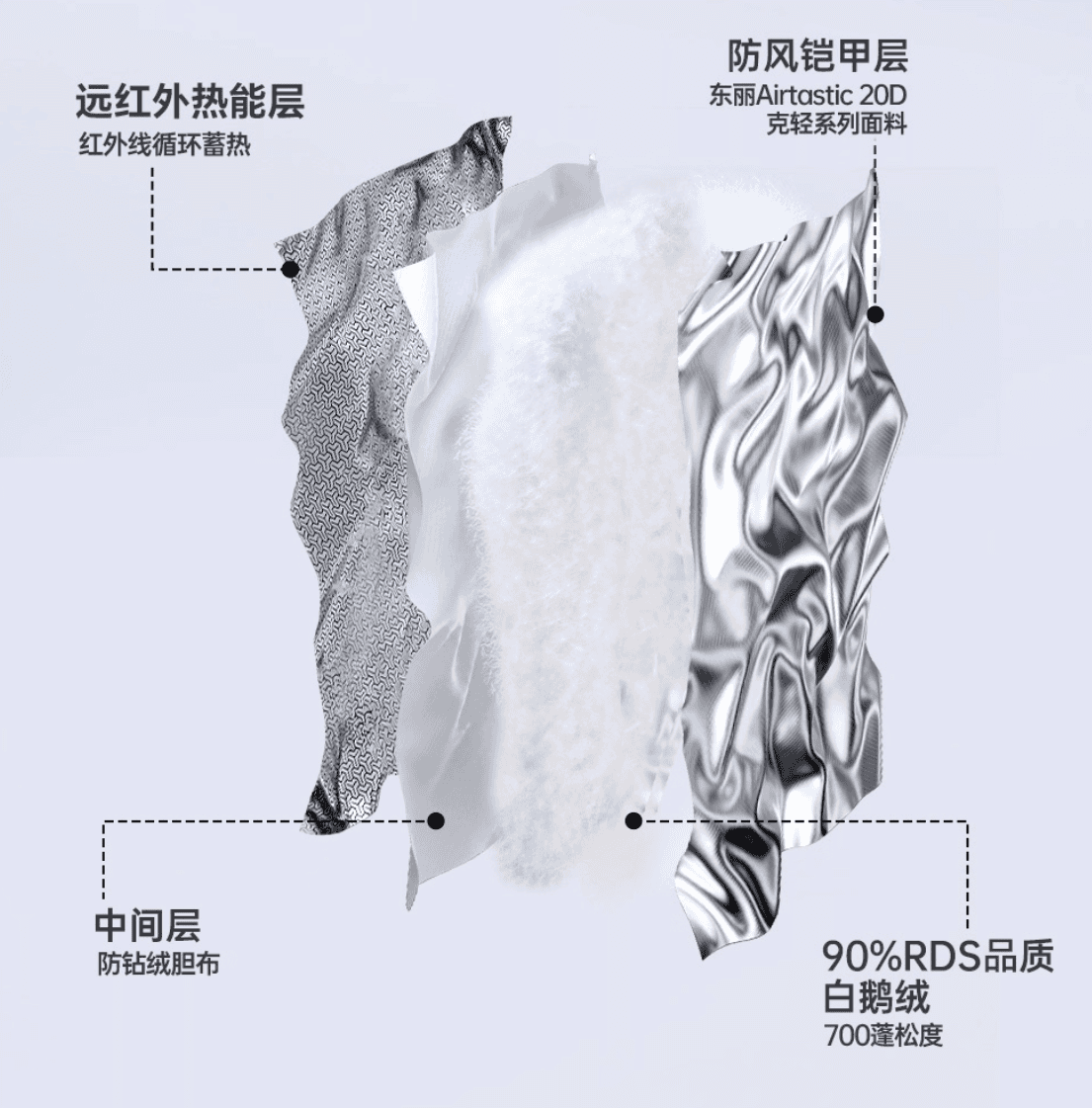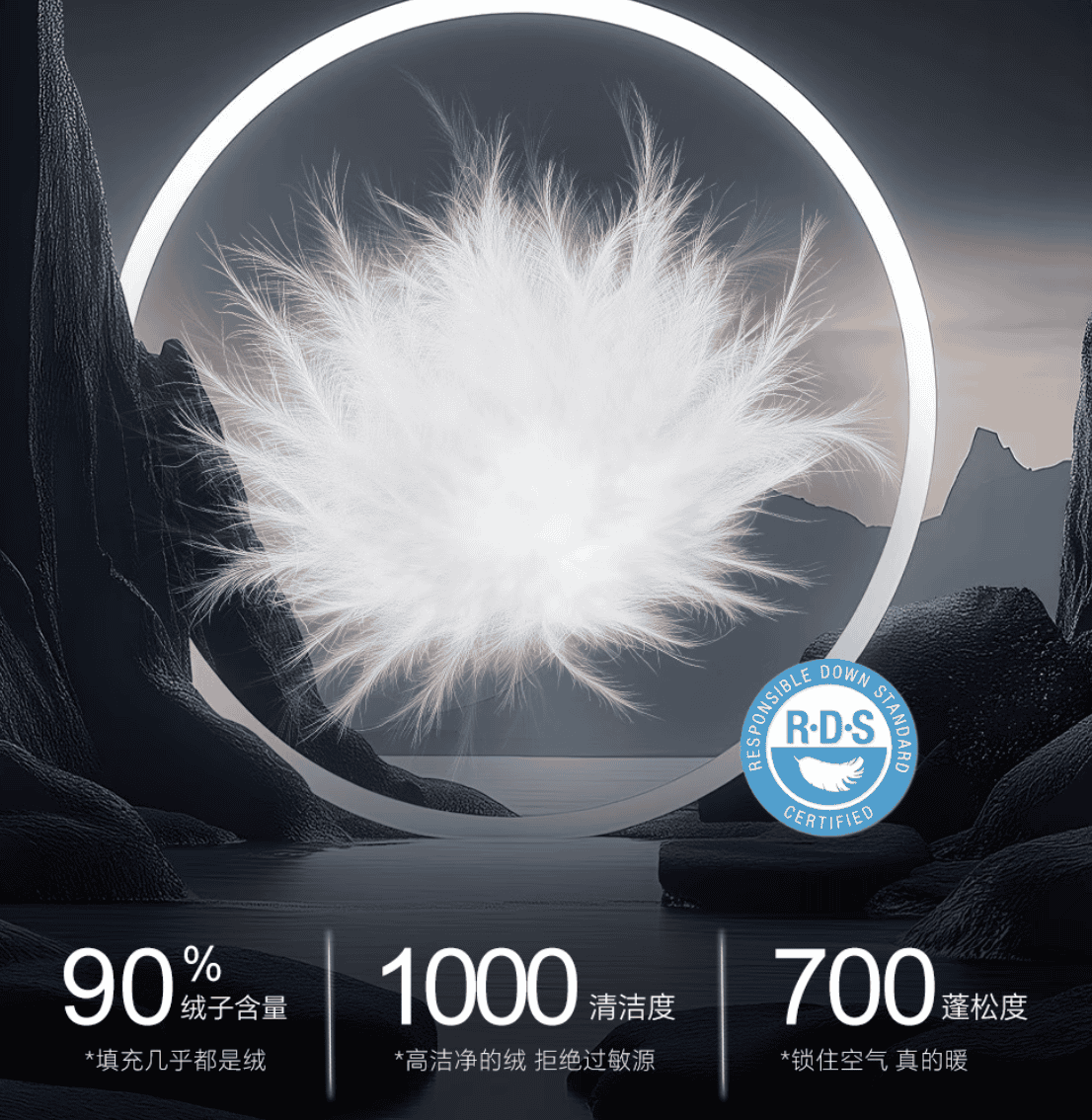 它的羽绒来源标注得很清晰,采用 RDS(负责任羽绒标准)认证 的鹅绒,供应链透明,更放心也更环保。从参数上说,就是 700 高蓬松度 + 90% 白鹅绒 的组合,属于偏专业向的配置,不是那种只堆“重量数字”但实际不暖的款。