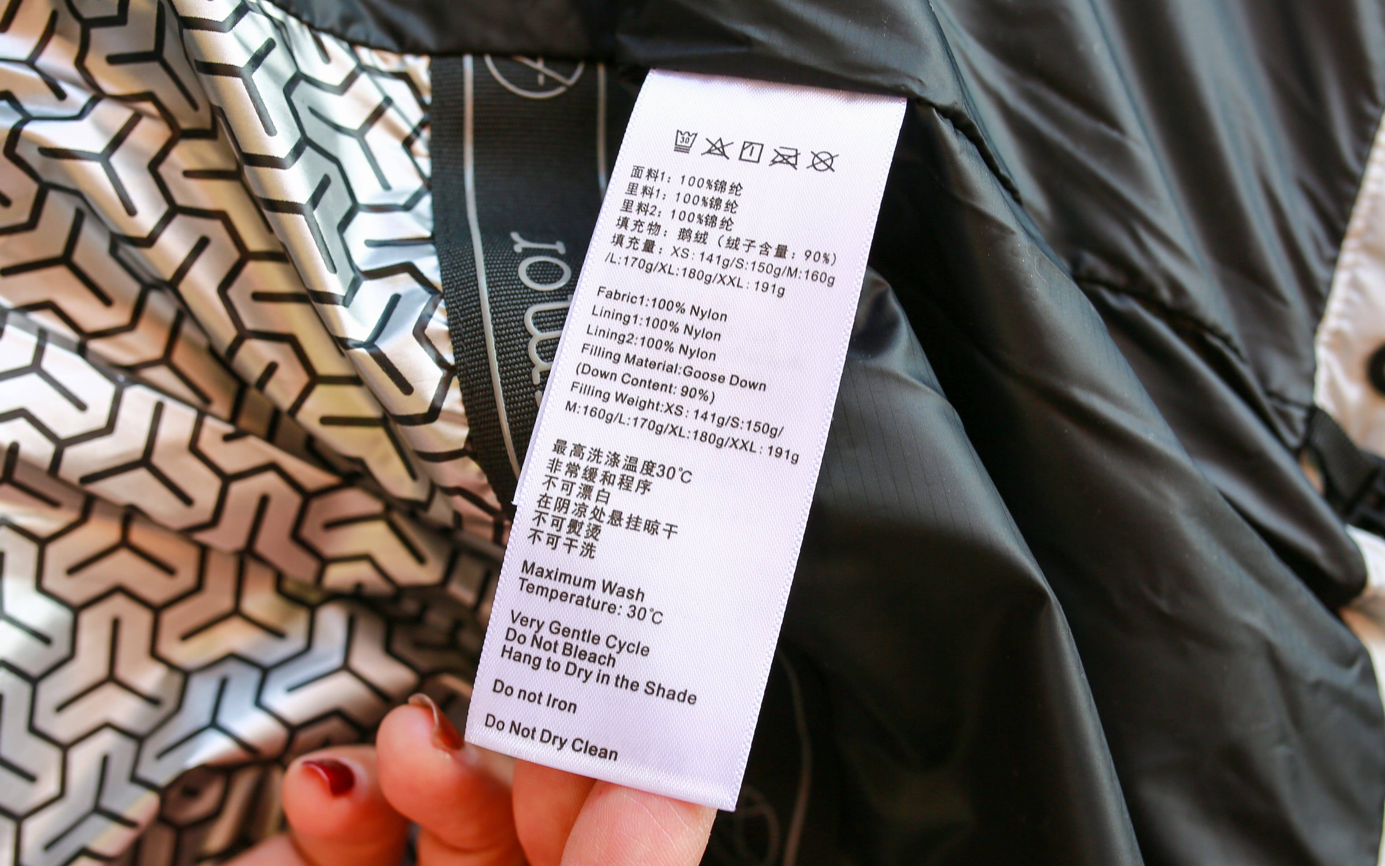 衣服内侧还藏着一个“小秘密”——一张像身份证一样的标签。拿开一看,里面把衣服的各种信息都写得明明白白:怎么洗、怎么保养、充绒量多少、能不能机洗、能不能烘干,全都一目了然。这种细节真的很实用,买回来不用猜,照着标签护理就不怕穿错、洗错,特别省心。