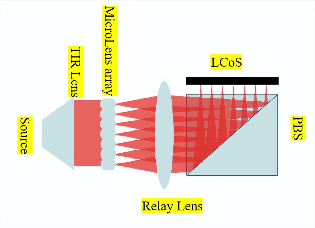 我们知道,光源发出的光线需要经过TIR透镜(或者反光杯)收光,收集大角度光线的能量(提高能量利用率),然后经过微透镜阵列(积分透镜)的匀光,经过中继透镜到达PBS膜(透P反射S光),最后打到LCoS上,照亮LCoS,作为LCoS的照明显示源。除了使用TIR+微透镜阵列匀光的方式,一些方案采用匀光棒的方案进行匀光,可达到的均匀光较高,但是对横纵比要求,一般要求至少在匀光棒内发生3次TIR反射,导致其结构体积较大,所以多采用TIR透镜对光源发出光线准直的比较多。