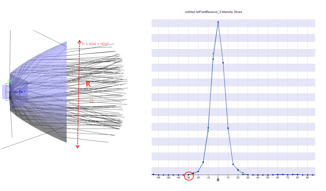 对于半球面内发光的LED光源来说,若需要收集其发出的所有角度光线,则只有使用TIR透镜,根据光展量守恒(光学系统第一个面发出的光展量等于系统最后一个面接收的光展量),若需要收光性能越好,则TIR透镜的半径越大,导致光学模组的体积越大,并且大角度光线如果耦合进波导之后,很有可能变成杂散光,干扰正常图像的显示,如下为TIR透镜半径对收光角度影响的对比: