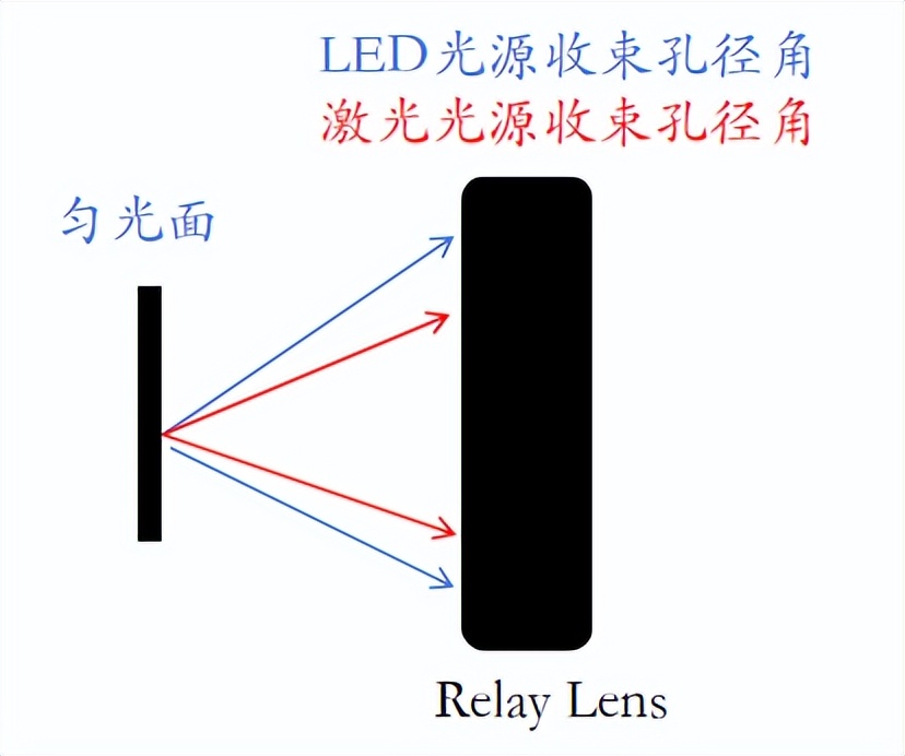 从公式来看,在发光面积一致的情况下,激光光源的发光角度小,则其光展量小,仅需少量准直光学元件即可对激光发出光束进行整形或者匀光设计,利于光机系统的轻量化设计。