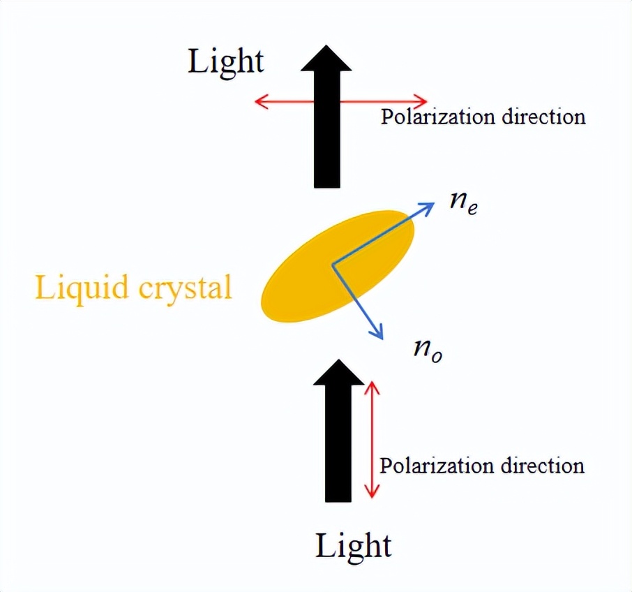 下图为液晶改变光的偏振态的原理:液晶具有双折射的性质,也就是存在快慢轴,液晶在快慢轴偏振方向的折射率不一致,经过液晶层之后,快慢轴方向就存在相位差,导致光线偏振态发生变化,使得光线强度或者相位的变化。