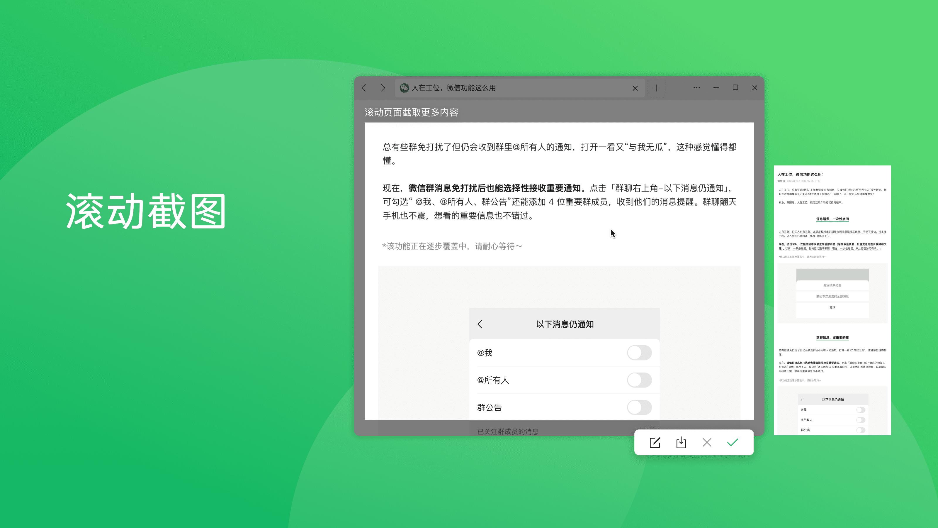 滚动截图:截图工具迎来增强,在框选截图范围后即可选择「滚动截图」,通过向上滑动来捕捉更长的内容。朋友圈、长网页、聊天记录等以往需要多次截图的场景,现在都可以一次性搞定。