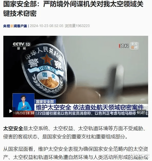在10月23日,官方发布神舟十九号即将发射消息的同时,中国青年报特地发布了一篇国安部的声明,声明中直接指出要严禁西方的间谍机构对我国的航天关键技术进行窃取。