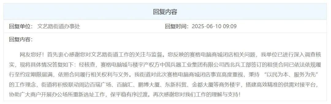在官方回应中,文艺路街道办事处表示对闭店事宜"高度重视",将"秉持公开、公平、公正原则,积极搭建沟通平台"。