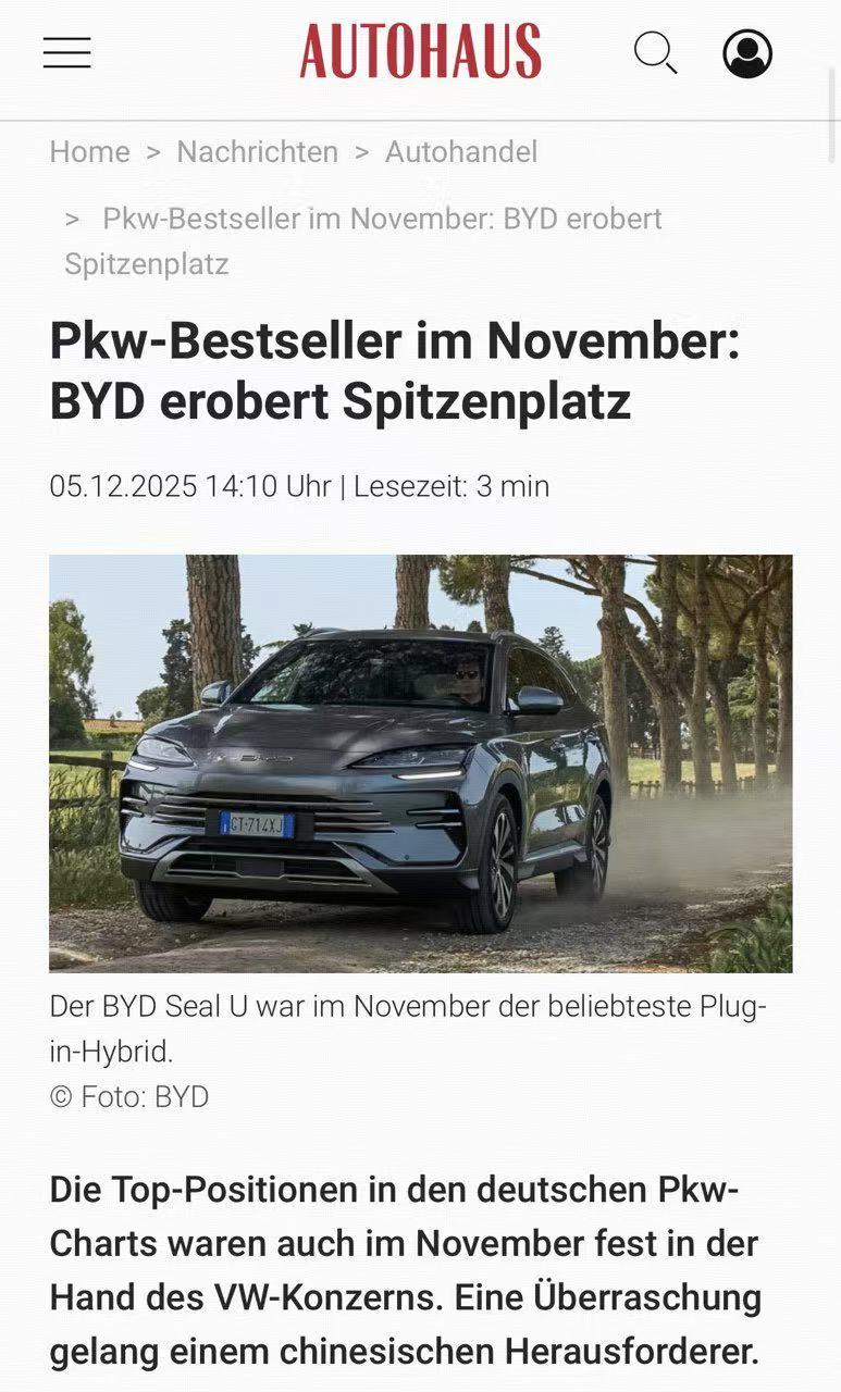 近日,BYD SEAL U(宋PLUS)成为德国11月车市插混车型销量冠军,欧洲市场格局正被重塑,引发行业广泛关注。这不仅是中国汽车品牌首次在德国主流细分市场登顶,更意味着比亚迪在欧洲的规模化突破已进入全新阶段。