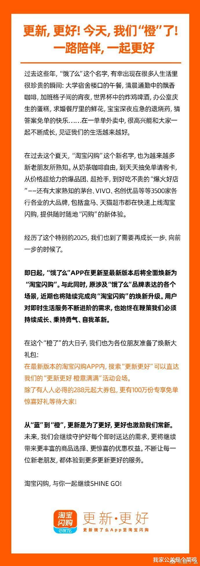 大家好,我是想要搜集200份公关信的菜鸡公关。12月5日,淘宝闪购发布公开信《更新,更好!今天我们“橙”了!一路陪伴,一