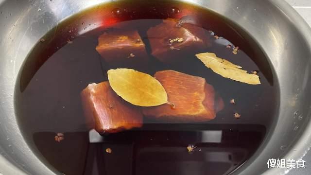 4、大火烧开后转小火,慢炖一个半小时到两个小时。俗话说“慢工出细活”,这小火慢炖出来的牛肉才入味,口感才够软烂。炖到用筷子能轻松插透牛肉,就说明好了。关火后别急着捞出来,让牛肉在汤汁里继续浸泡几个小时,最好是放冰箱冷藏过夜,这样会更入味。