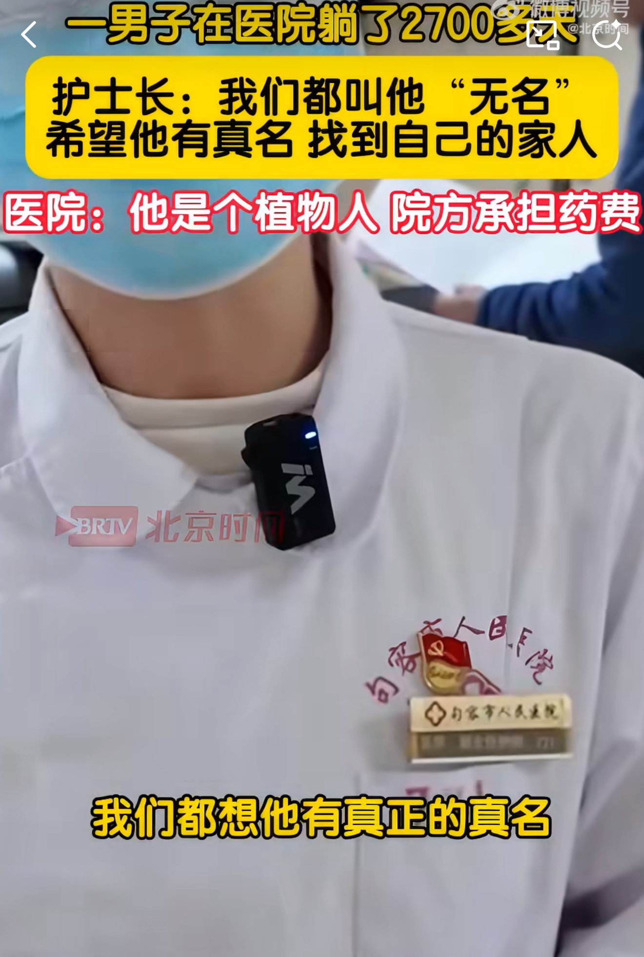 在江苏句容市人民医院,有这样一个让人揪心的故事。一名男子在医院躺了整整2700多天,这漫长的七年多时间里,他就像一个被世界遗忘的人,没有名字,没有家人陪伴在侧。医院里的护士长说,大家都叫他“无名”,可大家心里都盼着他能拥有属于自己的真名,能回到真正温暖的家。