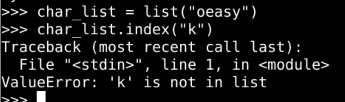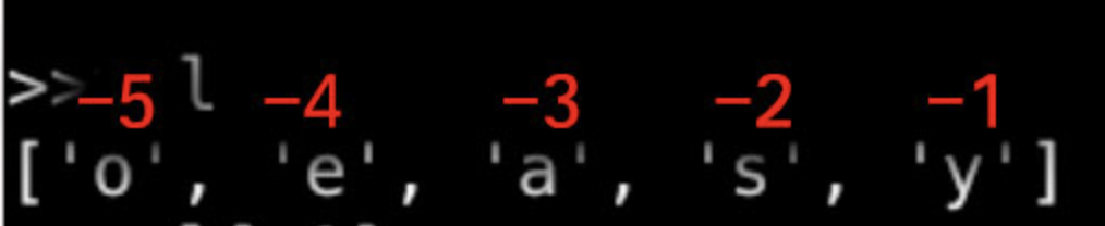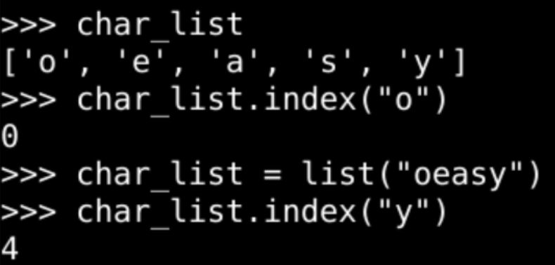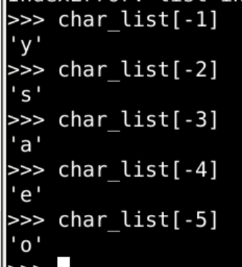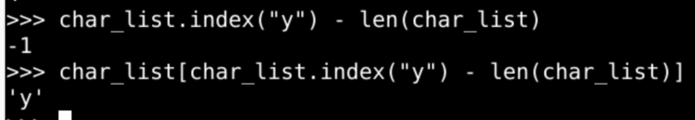 char_list.index("y") - len(char_list)char_list[char_list.index("y") - len(char_list)]