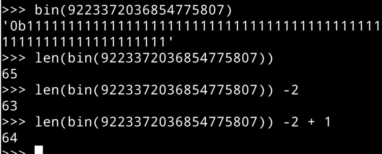 转化bin(9223372036854775807)len(bin(9223372036854775807))len(bin(9223372036854775807)) - 2 + 1