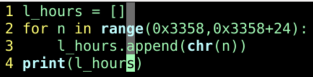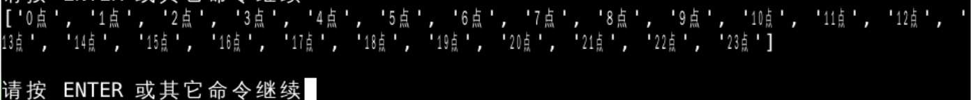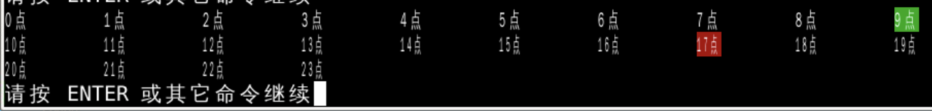 变色l_hours = []for n in range(0x3358, 0x3358+24): l_hours.append(chr(n))l_hours[9] = "\33[42m" + chr(0x3358 + 9) + "\33[0m"l_hours[17] = "\33[41m" + chr(0x3358 + 17) + "\33[0m"for hour in l_hours: print(hour, end="\t")