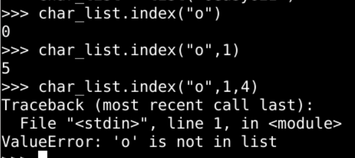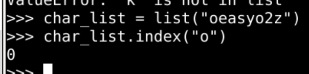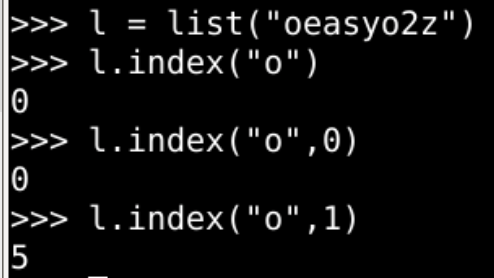 两个匹配char_list = list("oeasyo2z")char_list.index("o")