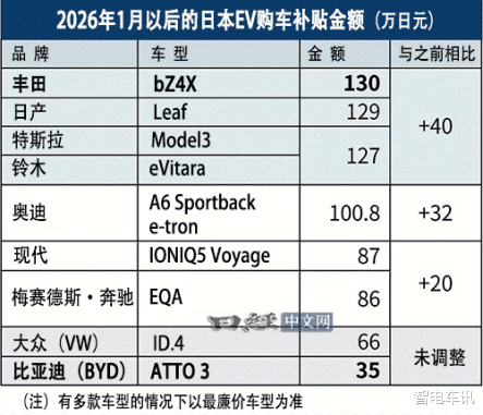 以元PLUS(ATTO 3)为代表的四款纯电车型,补贴依然被牢牢摁在35万至45万日元区间,而日系、美系同级车型却能拿到127万至130万日元。