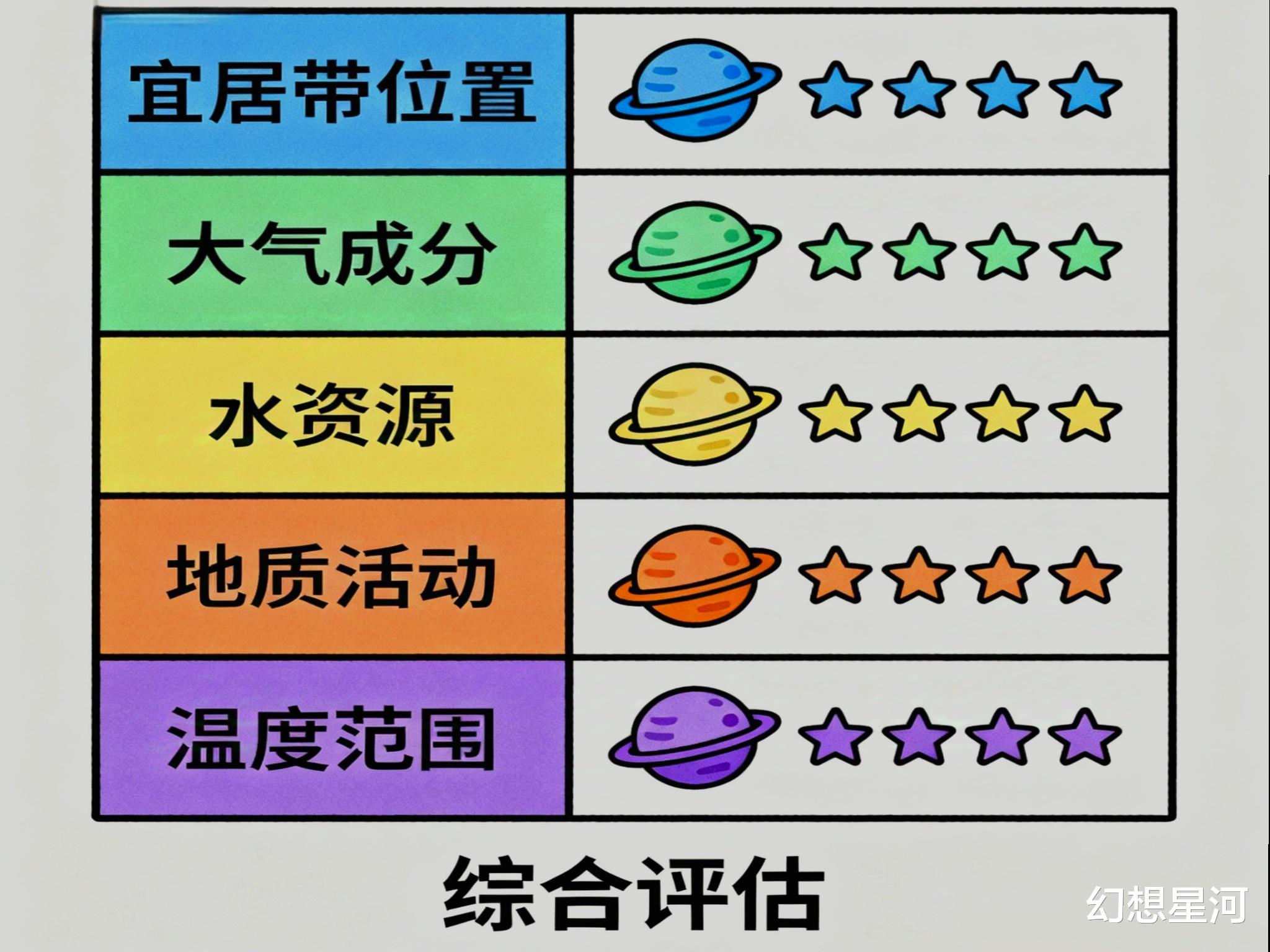 判断一颗行星是不是宜居,不能只看某一项,得把所有线索拼起来算综合分。在宜居带里,加1分,大气里检测到水蒸气和二氧化碳,还有云层,加1分,质量跟地球差不多,能留住大气,加1分,恒星不常爆发耀斑,脾气好,加1分,自转轴倾斜,有四季变化,加1分。得分高的行星,会成为宜居候选者,接下来会用更精密的深空望远镜再仔细观测。