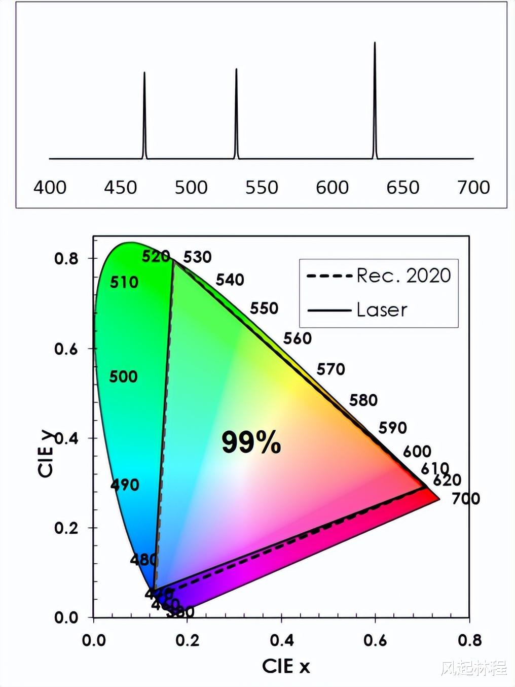 激光的光谱带宽很窄,这意味着颜色更加纯净,通过RGB三色合光,能够覆盖更加宽广的色域。例如激光显示覆盖的色域接近甚至超过BT.2020标准(>90%),而普通LCD通常只能覆盖sRGB或部分P3。