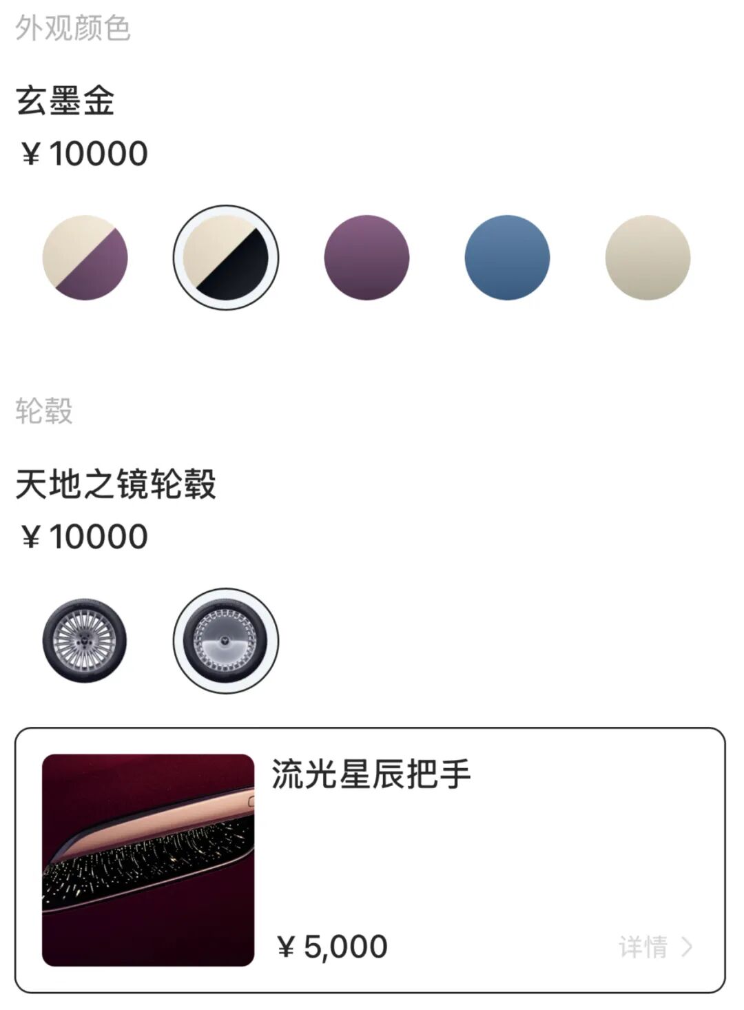 需要付费选装都是像“大饼轮毂”、双色车身、以及星河元素门把手这样的外观件,大家可以根据自己的审美以及钱包来进行选择。