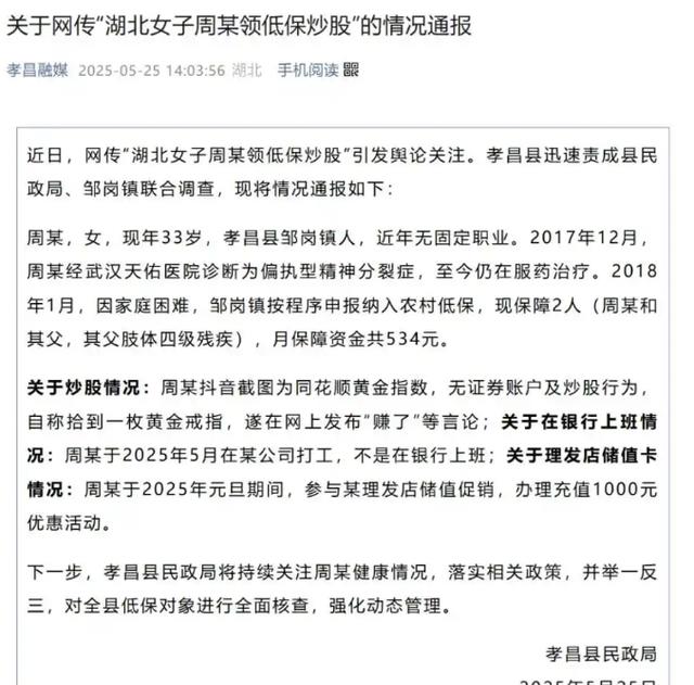 此事很快就引发了当地相关部门的注意,随即组织团队针对小周进行调查,结果一查不得了,这个女富婆还真的是低保户,并且在本月还认证过一次。