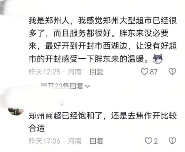 于是当于东来官宣胖东来最新店铺将选址于郑州之时,不少“郑州人”纷纷站出来呼吁,不建议在郑州开胖东来,而是开在自己的家乡。