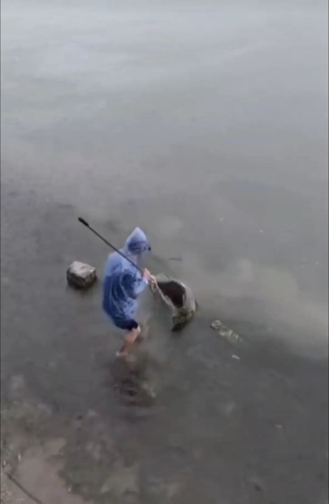 激烈搏斗:鱼被拖至岸边时剧烈挣扎,抄网被拉扯变形,最终众人合力将其拖上岸。