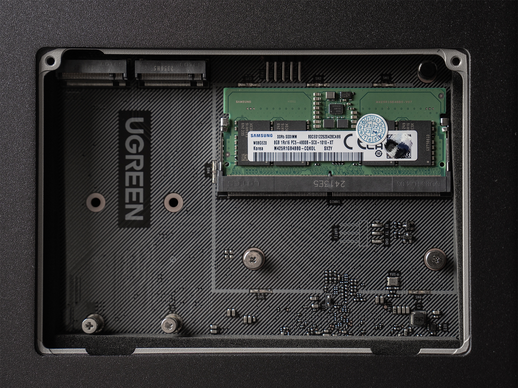 内存方面,绿联DXP4800标配单条8GB三星DDR5笔记本内存,作为大厂内存其在性能和稳定性上都有所保障。扩展性方面,绿联DXP4800内存最大可扩展至16GB,硬盘在4个机械硬盘和2个固态硬盘都满配的情况下,总容量可达136T。