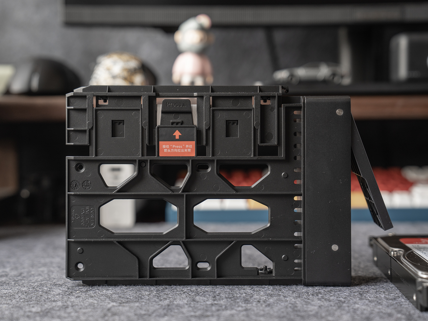 硬盘托架的底部设计有硬盘童锁,可以很好地防止不当操作造成的硬盘损坏。