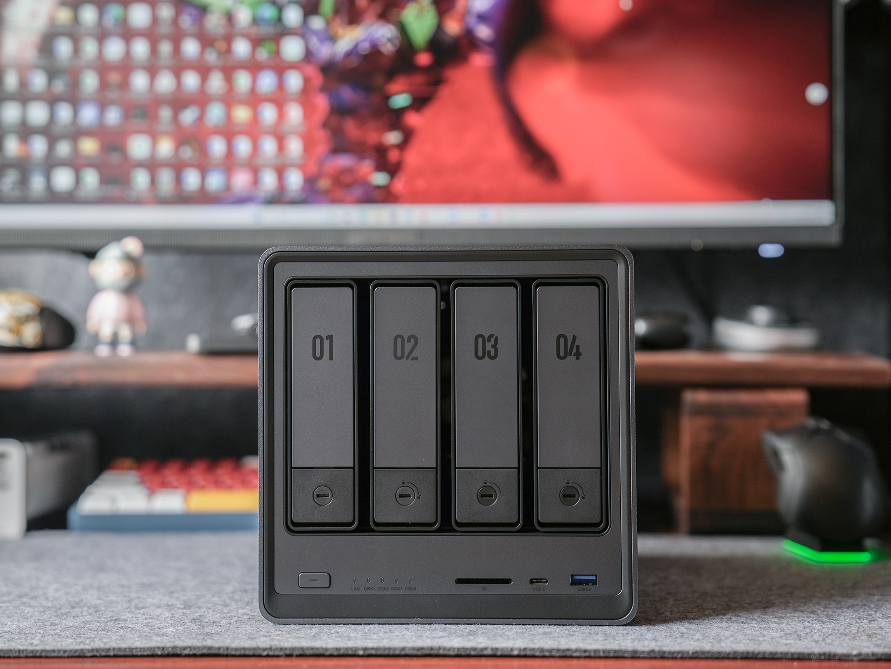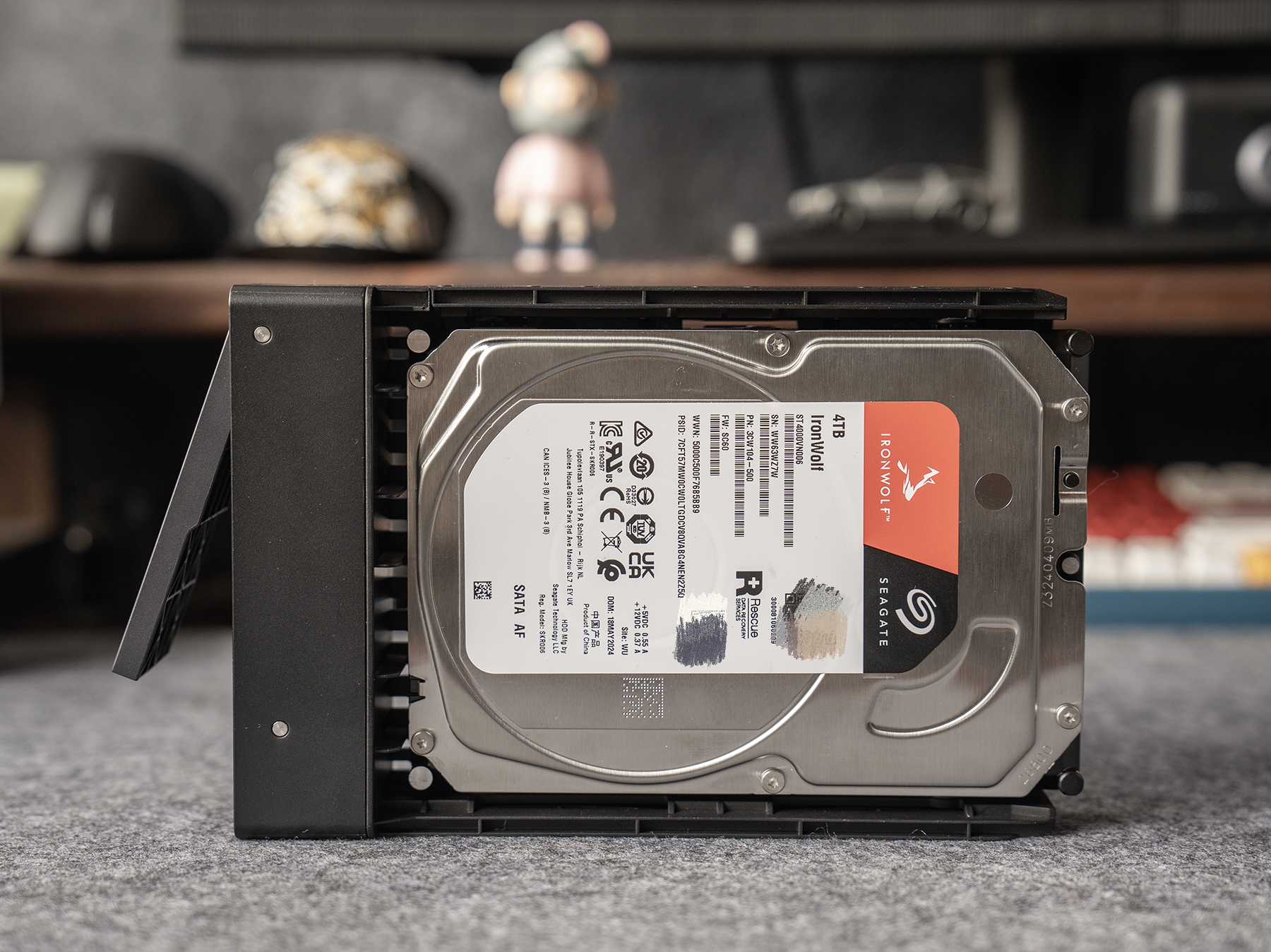 绿联DXP4800为四盘位设计,每个硬盘托架可放入3.5/2.5英寸机械硬盘,其外侧印有相应的数字编号,方便区分。