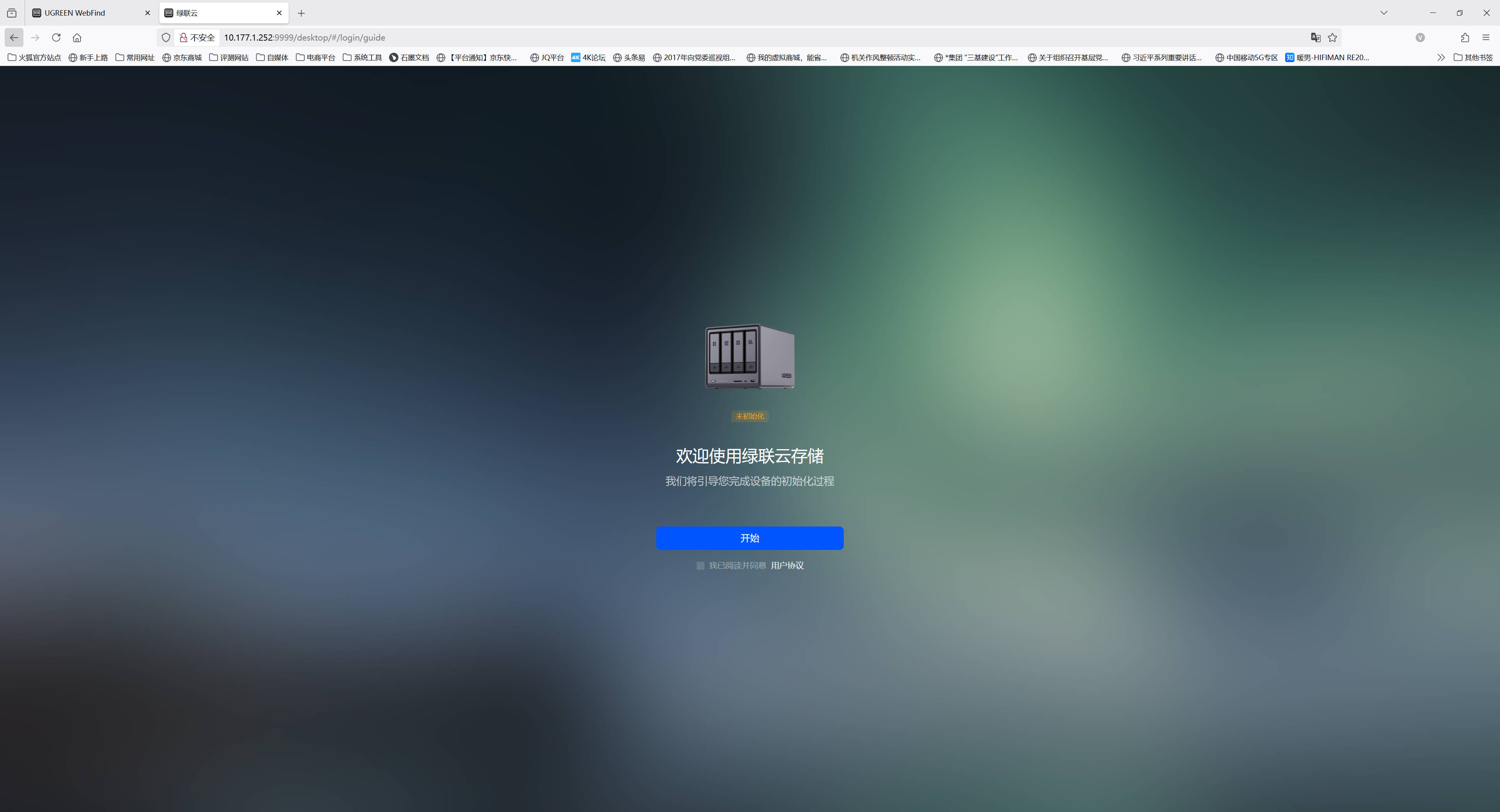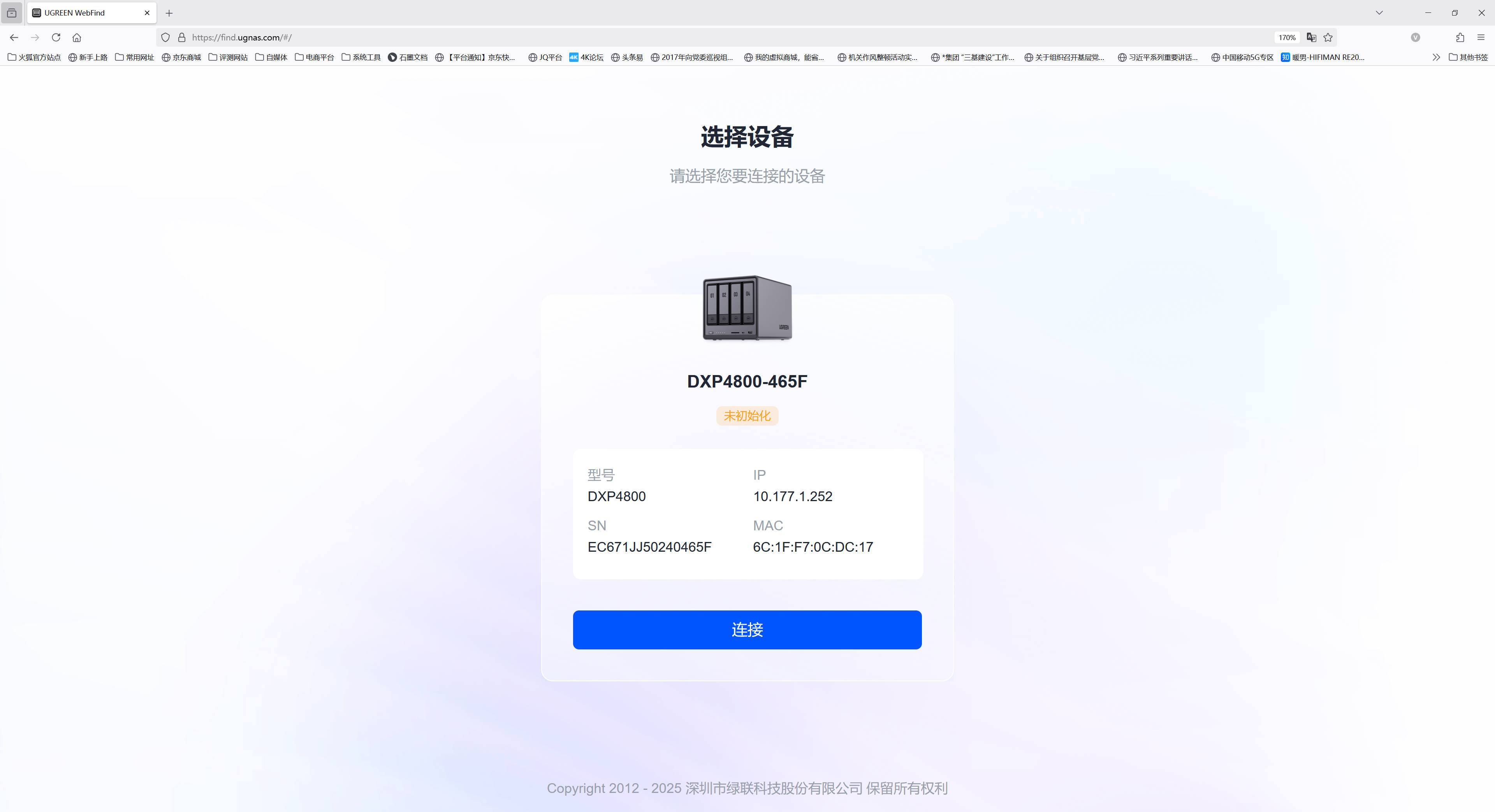 硬件安装结束后,NAS还不能正常使用,需要将NAS连接电源、接入有线网络,并通过电脑或者移动设备访问:find.ugnas.com,这时页面会弹出局域网内的绿联DXP4800,连接即可。