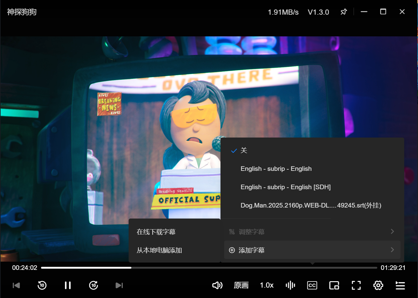播放方面,「影视中心」自带播放器,支持断电续播、清晰度选择、播放速度选择、字幕选择以及音轨选择等功能。而且,针对一些没有内嵌字幕的电影,影视中心不仅提供外挂字幕功能,还可以在线下载字幕,免去了自己从网站上搜索下载字幕的麻烦。