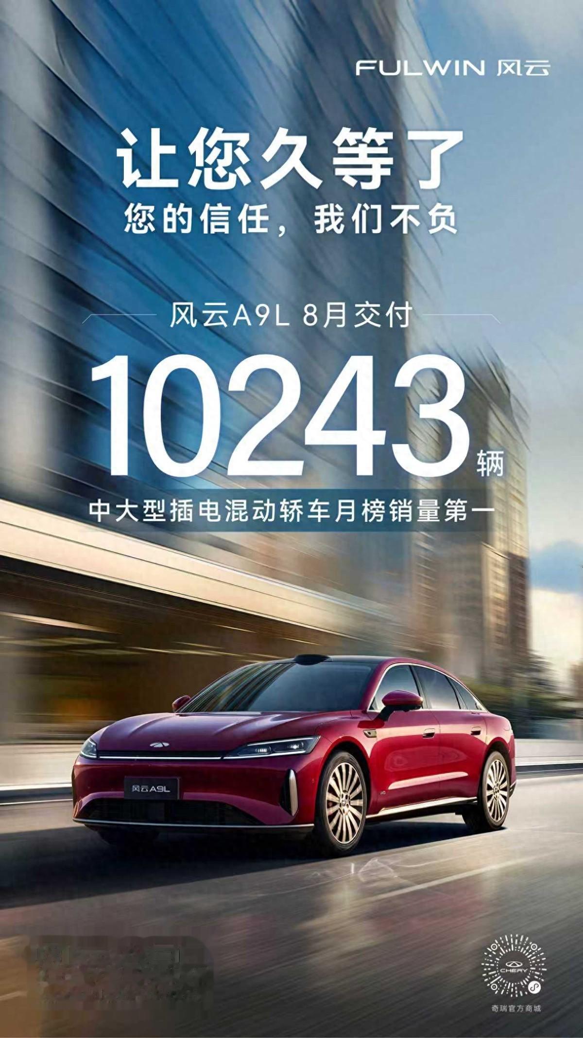 自 7 月上市以来,奇瑞风云 A9L 便持续点燃市场热情。8 月份,该车连续四周稳居销量榜首,最终以 10243 辆的单月交付成绩,强势登顶中大型插电混动轿车市场。这一成绩不仅是产品硬实力的直接印证,更彰显了奇瑞体系化造车与高效交付的深厚底蕴,标志着合资品牌长期垄断高端轿车市场的格局正在被彻底改写。