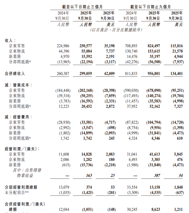 13 日晚间,京东发布了三季度财报,整体收入为 2991 亿元,增长 15%;扣掉营业成本、履约成本、销售管理研发费用之后,经营亏损为 10.5 亿元( 最后净利润为正的 53 亿元主要是因为有 70 多亿的投资收益等非经营所得 )。