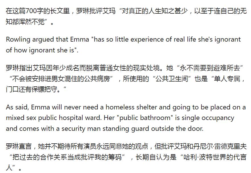 2012年因慈善掉出福布斯富豪榜 ,但她一点也不在乎 ,大部分金钱都是她在被针对得最剧烈的时候捐掉的 ,冲这个就比任何只会动嘴皮子的人强出百亿倍。我觉得虽然罗琳这份声明非常坚定并直指问题核心,但她对艾玛还是有一点最后的温柔的,就在谈论为何艾玛会支持跨性别那一段,多少有点意思说她涉世未深就进入名利场,不清楚真实情况就好心办坏事,不然以罗琳的文笔,绝对能更不带脏字又一针见血的说出她的虚伪与就是为了利益而站队的傲慢。唉,说是你只是曾经的合作者,但还是给了她一点最后的体面