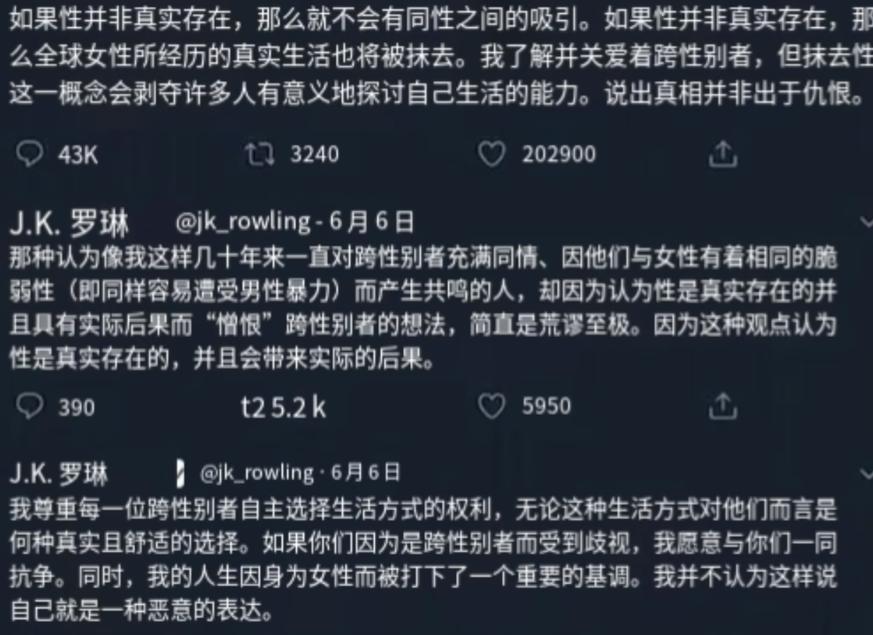 首先罗琳对第三性别的态度不是全盘否定,她持尊重态度,但是拒绝未经过任何改造的、仅凭口头主张的、随意更改的“跨性别”者窃取普通女性的权益,比如手术改造、激素改造。