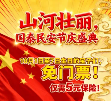 ▪️ 身份开挂:名字含 “国庆”、“庆节”、“节庆” 或 10 月1日至7日生日的宝子,免门票!仅需 5 元保险!