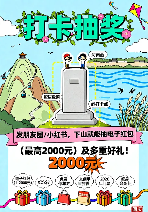 ▪️ 打卡抽奖:到黛眉极顶拍黄河大观、一脚踏两省界碑等元素发朋友圈 / 小红书,下山就能抽电子红包(最高 2000元)(电子红包(1-2000 元,24 小时内发至登记微信))、纪念衫、免费停车券、国旗贴纸、文创手提袋、2026年全年不限时间使用的门票、终身免门票会员卡等礼品。