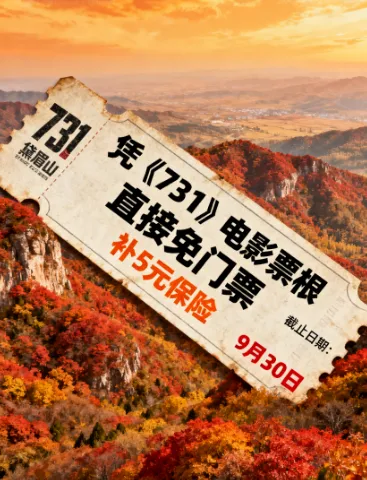凭《731》电影票根,直接免门票,补 5元保险!让观影后的思绪,在黛眉山秋景里沉淀,截止到9月30日别错过。