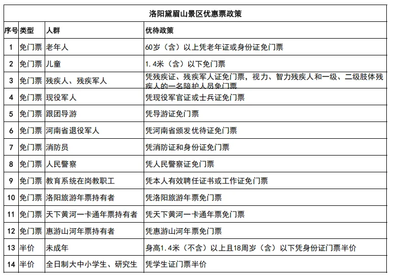 符合相关条件的老年人、儿童、残疾人、残疾军人、现役军人、跟团导游、河南省退役军人、全国在职消防员、人民警察、洛阳市教育系统在岗教职工可免门票,未成年和全日制大中小学生(不含成人教育研究生)凭相关证件门票半价。