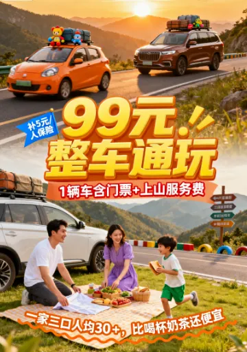 99 元整车通玩!不管小轿车还是7座 SUV,1 辆车含门票 + 上山服务费,补 5 元/人保险就行。一家 3 口人均 30+,比喝杯奶茶还便宜!