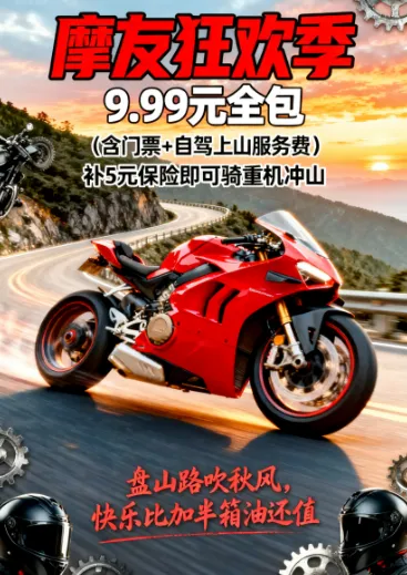 9.99 元全包!含门票 + 自驾上山服务费,补 5 元保险就能骑着重机冲山!盘山路吹着秋风,快乐比加半箱油还值~